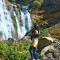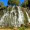 Переливаясь каскадом по ступенчатым выступающим камням, широкий водопад впечатлял своим масштабом. На вершине обрыва возвышались большие деревья, а окретсности водопада утопали в зелени.