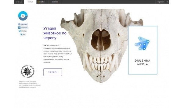 Дарвиновский музей и популярный молодежный информационный ресурс W→O→S разработали совместный интерактивный проект «Угадай животное по черепу». Посетителям предлагается проверить свои знания по анатомии животных и угадать, какому представителю братьев наших меньших принадлежал каждый из десяти черепов. Для съемок были отобраны экспонаты из остеологической коллекции музея, причем то или иное животное можно определить только с помощью детального изучения челюстей, зубов, глазниц и тд. Каждый череп можно вращать с помощью мыши! Выбрав верный ответ, вы увидите небольшой пояснительный текст с описанием данного экземпляра, составленное хранителем остеологической коллекции Дарвиновского музея Дмитрием Милосердовым.Начинайте угадывать уже сейчас, пройдя по ссылке http://w-o-s.ru/article/6008