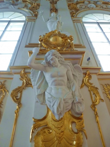 Солнечные лучи, устремляющиеся из окон, отражаются в зеркалах противоположной стены и, скользя по золоченым лепным орнаментам и белым мраморным статуям богов и муз, делают интерьер еще более выразительным.
