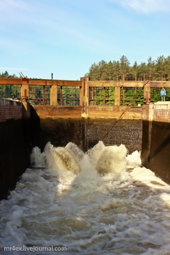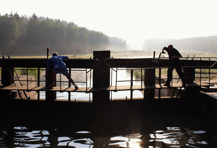 Бравые ребята вручную открывают ворота шлюза