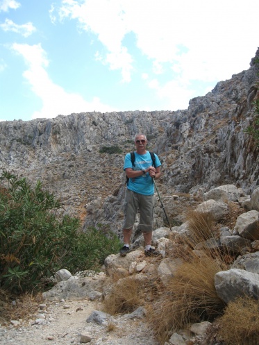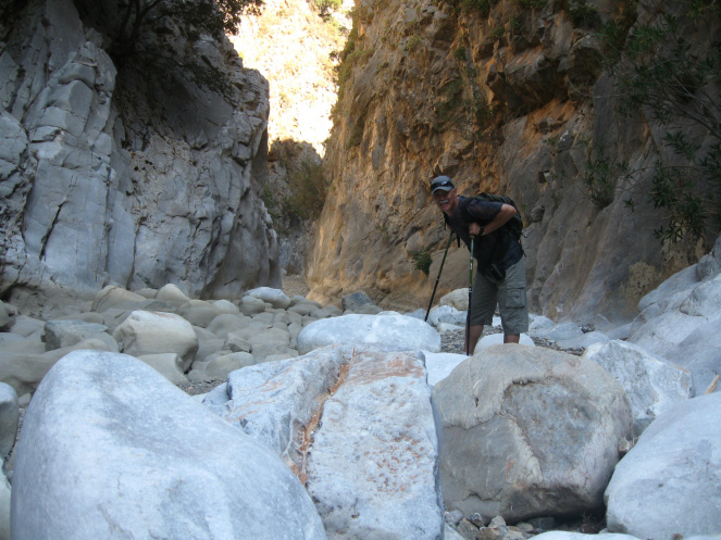 Слышен глухой перезвон колоколец-ботал, впереди козье стадо, широко разбредшееся по руслу и высоко - по склонам. В тени дерева сидит немолодой пастух, обмениваемся традиционными «Калимэра» - «Я сас». Платаны, растущие прямо в русле, как щупальцами обвивают корнями огромные валуны, иначе по весне снесет мощным потоком.