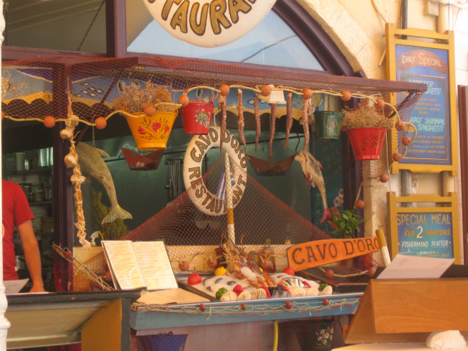Долго гуляем по узеньким улочкам старого города мимо крохотных таверн в 3-4 столика, мимо магазинчиков, торгующих всем на свете, любуемся на фонтан Римонди, Венецианскую Лоджию (надо заметить, венецианцы вообще здорово отметились на всем средиземноморье, и здесь их влияние тоже чувствуется в архитектуре, в названиях улиц и отдельных построек…) В гавани на набережной, как и должно быть, многолюдно, многоязычно, шумно. Возле пирса такое же разнообразие судов: от трехметровых обшарпанных рыбацких шаланд до роскошных, сверкающих лаком, двадцатиметровых яхт.