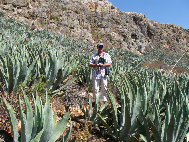 На Грамвусе разделяемся. Мама остается на пляже, папа с дочкой бодро скачут вверх до крепости обходными козьими тропами, т.к. большинство «паломников» поднимается по основной тропе слишком медленно в неподходящей обуви, в неудобной одежде… Осматриваем крепость, в бинокль находим маму на пляже и так же резво сыпемся вниз. На полдороге останавливаемся в зарослях агав - алоэ-переростков. Колючие – по ребру листа растут острые круто загнутые крючки.