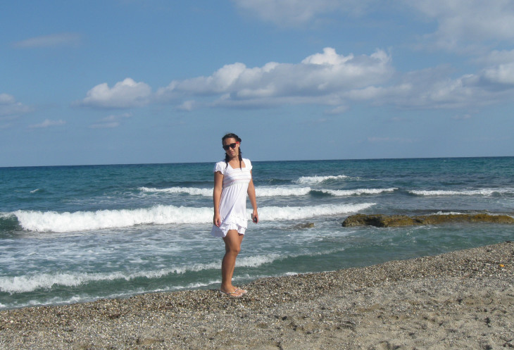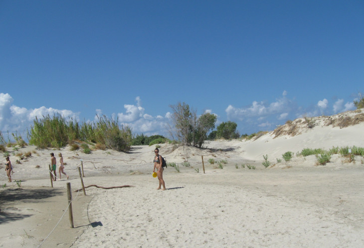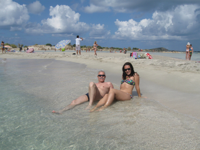 Шлепаем в сланцах мимо лежаков и зонтов, мимо вышки спасателей, Голубого флага, пересекаем мелкую, по колено, стометровую бухточку и располагаемся на длинной островной косе. Сзади бухта и обустроенный пляж, справа – остров, впереди – Ливийской море. Белый песок с розоватым оттенком, мягкий прибой. Заход в воду пологий и длинный.