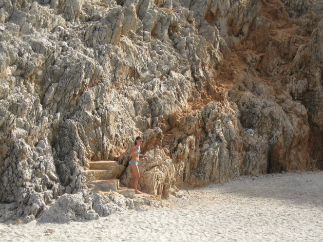 Внизу на площадке еще только одна машина. Вокруг довольно мрачное буровато-серое плоскогорье. Из растительности только низенькие довольно злые и жесткие колючки. Здесь всегда так или это потому, что сейчас уже осень? Подходим к самому краю и заглядываем вниз. Ух, ты! Короткое, метров 300, узкое ущелье с вертикальными стенками. Но пятьюдесятью метрами ниже видна неширокая полоска пляжа и ослепительно бирюзовая вода. Несмотря на крутые склоны, спуститься к воде можно практически в любом месте, скалы образуют узкие и высокие, но ровные уступы. Самый простой и удобный спуск начинается справа от часовенки-киота с крестом. Тот, кто в состоянии самостоятельно подняться по лестнице до 5 этажа, пройдет и здесь. Нужно только позаботиться об обуви – в сланцах или шлепках будет трудновато.