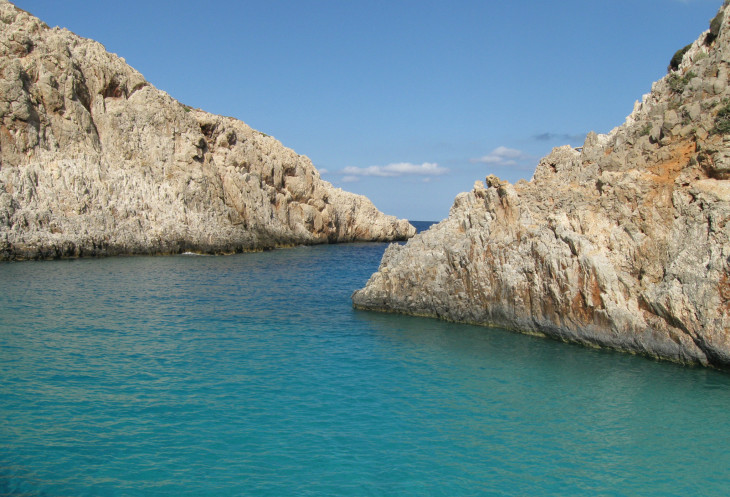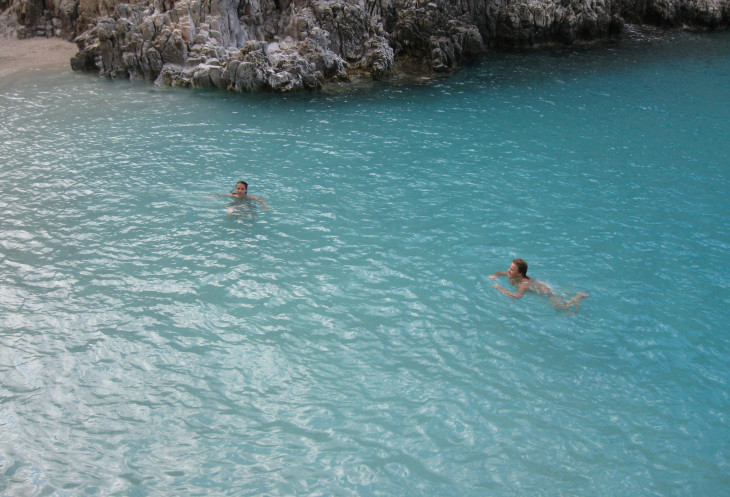 Возле самого берега вода нереально голубого цвета. В этом месте ширина ущелья не больше 20 метров. Чуть дальше стены круто изгибаются вправо, поэтому с любой точки пляжа бухта кажется полностью закрытой. Чтобы увидеть открытое море, нужно заплыть хотя бы на 50 м от берега или немного забраться вверх по скалам.