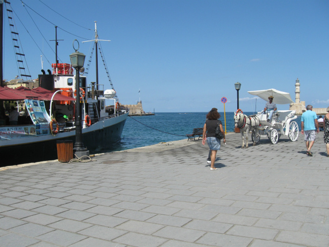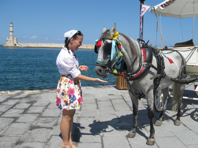 На площади возле Мечети янычар в колонну стоят экипажи, запряженные невысокими жилистыми лошадками. Нам понравилась серая. Конная экскурсия вокруг старого города стоит 10 евро с человека. Неторопливо шагом едем по набережной вдоль таверн. Звонкий стук подков по мостовой преумножается, отражаясь от стен зданий. Из таверны выбегает официант, передает кучеру половинку батона для лошади, смотритель автопарковки поднимает шлагбаум и на ходу угощает лошадку яблоком, на узкой улочке до ближайшего перекрестка за нами терпеливо и молча следует кортеж из полутора десятков машин… Школа, стены которой испещрены граффити, дети радостно машут руками, понятно, это лошадке, но нам все равно приятно. На асфальте цокот копыт становиться глуше, лошадка переходит на мелкую рысь, кучер, молодой грек Димитриос, на английском рассказывает о проплывающих мимо достопримечательностях. В конце экскурсии обязательное кормление лошадки морковкой. Дочь в полном восторге. Прощаемся с лошадкой и кучером и, двигаясь по набережной мимо Арсенала, бесконечного ряда таверн, старых доков, выходим на длинный мол, ведущий к маяку. Отсюда, как в панораме, прекрасно видны и старый город, и вся гавань.