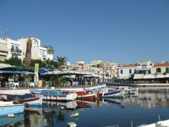 Озеро Вулисмени производит немного странное, почти мультяшное впечатление. С одной стороны гладкие вертикальные скалы, с другой – кафешки у самой воды (цены очень даже не мультяшные), дома с ослепительно белыми стенами и черепичными крышами; над крышами плавно плывут трубы и мачты круизных лайнеров; а в середине почти идеально круглая акватория бухты с водой бездонного синего цвета. Ну чем пробурили здесь дырку в земле такой правильной формы и такого диаметра?!