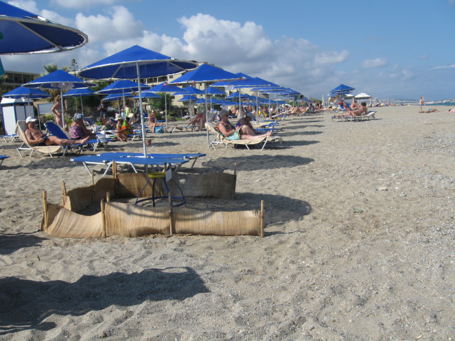 А вот и кладки яиц знаменитые критских черепах каретта-каретта! Прямо на пляже между лежаками. Снабжены табличкой, защитной пирамидкой и огорожены списанными соломенными ковриками. Черепашата вылупятся только в октябре, жаль, не увидим.