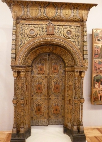 Здесь представлены драгоценные изделия ярославских и московских мастеров XII - XIX веков в основном из коллекции Спасо-Преображенского монастыря. Оклады икон и книги, сосуды и одежды священнослужителей, кресты и панагии… Обилие алмазов, рубинов, изумрудов, сапфиров, серебра и золота, резьба по камню и разноцветные эмали, вышивка жемчугом. Она меня просто поразила, настолько тонко выполнена. Некоторые жемчужинки меньше миллиметра!