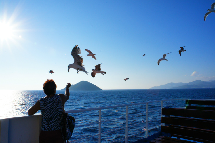 Трогательные моменты можно было наблюдать во время переправы на пароме до материка. Все протягивают угощенье чайкам, сопровождающим паром. Такие у всех лица счастливые. А если паром красного цвета, то просто волшебная картина: морская пена окрашивается в розовый цвет и чайки тоже. Нереально красиво.