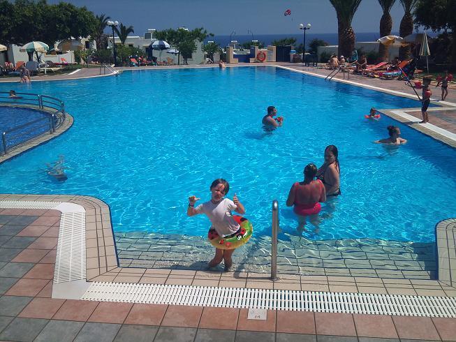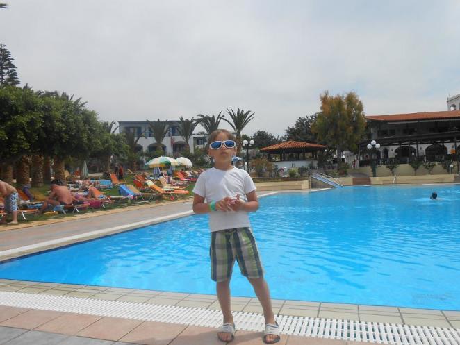 Пляж. Вот один из основных моментов – пляжа у отеля нет. Хотя вид на море в отеле присутствует и из номеров основного здания и из ресторана. До пляжа идти примерно 7-10 минут. Дорога не проезжая, в основном из транспорта – машины и автобусы, которые едут к отелям. Можно купаться и загорать там, где выберешь. Мы ходили в основном на пляж соседнего отель Альдемар. Там есть песочек, но вход в море – камни, я делала два шага и сразу уплывала. Плаваю я далеко, поэтому, хотя море и прохладное, но я попадала в разные теплые течения, и мне было классно!!! Моя коллега искупалась за весь отпуск раза 3-4. Работая гидом в Греции, Турции и Египте, она привыкла плавать в теплом море, и для нее было трудно зайти в такое прохладное. Саша у меня любитель воды, поэтому он купался, правда, не на этом пляже, так как здесь войти трудно из-за камней, на которых, кстати, есть ежики. Поэтому, будьте осторожны и покупайте специальную обувь для входа в море. В лавках и магазинах на Крите её полно. Мы спокойно пользовались лежаками соседнего отеля, ничего не платили, здесь так было можно. Мы даже плавали у них в бассейне с морской водой. Открыли мы его благодаря моему сыну, который с криками и воплями: «ГОРКА!!! ГОРКА!!! ГОРКА!!!» помчался в бассейн, и остановить его мы уже не смогли. Поэтому мы пошли за ним, разместились на лежаках и купались в бассейне. Горка там длинная, но не крутая, Саша резвился в своё удовольствие, а мы в своё, потому что можно было поплавать в теплой морской воде. Приходили мы сюда достаточно часто. Поэтому никакого дискомфорта из-за отсутствия пляжа мы не испытывали. Из отеля 2 раза в день ходил автобус, который возил на какой-то пляж и в город. Мы им не воспользовались, так как уходил он в 10-05, а мы к этому времени только просыпались и бежали на завтрак, иногда и туда не успевали. Поэтому ничего не могу сказать про тот пляж, на который ездили гости из нашего отеля.