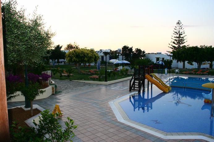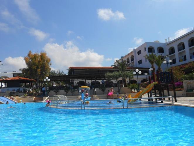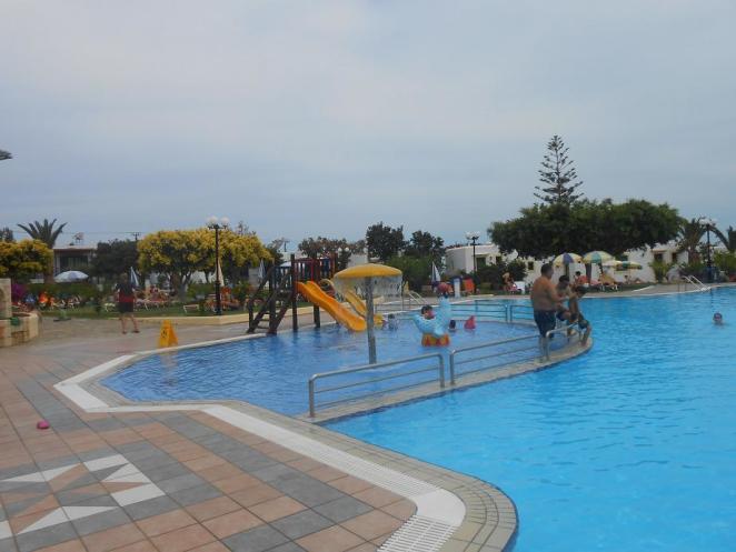 Территория отеля. Когда мы выбирали отель, уже тогда нам понравилась Chrissi Amoudia 4* из-за своей красивой, зеленой территории. Мы жили в бунгало, за окном был настоящий сад. Вокруг цветущие деревья и кустарники, цветы и мягкая как ковер травка. На территории один большой бассейн с детским отделением и небольшой горочкой для детей. Конечно, моего сына такая горка совсем не впечатлила, поэтому мы ездили в Херсонис в отель Стар Бич, он открыт для всех посетителей. Лежаки - 3 Евро, аква-парк с пятью большими горками – 8 евро, а также на территории много закусочных, песчаный вход в море, различные бассейны с водопадами и гидромассажем, детскими бассейнами, пенные дискотеки. Всё это абсолютно бесплатно, кроме еды и напитков в барах, кстати, это тоже всё по очень приемлемым деньгам. Возвращаюсь к территории нашего отеля. Кроме всего перечисленного: ресторан, бар у бассейна, лобби-бар, вокруг бассейна лежаки и зонтики. Есть еще мини-клуб для детей, игровая площадка, сцена для развлекательных мероприятий, теннисный корт, волейбольная площадка.