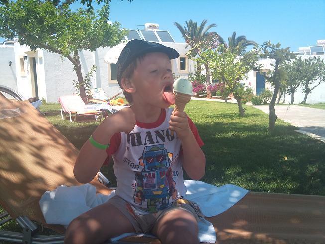 Питание и напитки в отеле. Кухня вполне нормальная, особых изысков нет. На обед и ужин всегда есть мясо: говядина, свинина, курица и какая-то белая рыба. Овощи, зелень тоже присутствуют. Фруктов мало, в основном яблоки, груши, давали дыню. Из десертов: пахлава, творожные и фруктовые пироги, разное желе, финики, фруктовые и шоколадные топинги, мёд и мороженое. Для моего сына мороженое было основным и второстепенным блюдом в течение всего дня. Утром и в обед он добывал его в холодильнике бара у бассейна, вечером – в ресторане. Из гарниров: картофель фри, жареные, пареные и тушеные овощи, макароны с разным соусом. На завтрак всегда омлет или жареные яйца, различный «сухой корм» в виде всяких разных хлопьев и шариков, а также булочки и тосты с топингами, сосиски и сардельки, чай, кофе и молоко. В обед варили супчики, супы-пюре: картофельный, луковый, из брокколи. Мне понравился брокколевый суп. На ужин кроме всего прочего жарили шашлычки или мясо гриль. Салатики всякие овощные были в любое время и брынза. Мне понравилось, что заправляли салаты маслом и сметаной, а не жутким майонезом, очень вкусно. В целом, готовят хорошо, еда без острых приправ, что очень радует после Турции и Египта. Кроме 3-ех основных приемов пищи, всегда можно было перекусить булочками с чаем, мороженым иногда пиццей и другими закусками в баре у бассейна. В общем, наши фигуры очень пострадали, по мне это стало заметно уже через два дня, а по моей коллеге через пять, что меня не могло не порадовать, ведь толстеть одной не хотелось, такая вот женская дружба!!! Напитки по всё включено: чай, кофе, разливные газированные напитки, такие как кола, фанта, содовая и прочее – постоянно. Из спиртного: разливное пиво, местное разливное вино, бакарди, ром, узо, раки, виски… хоть чистый со льдом, хоть в коктейлях. Всё разливное разбавлено, пиво мы вообще пили на завтрак, обед и ужин, чтобы утолить жажду. Нет… на завтрак, мы, конечно, пили чай и кофе. Коктейли разбавляют колой и всякими химическими соками, моя коллега могла пить только бакарди-колу, а я пиво – это самое натуральное. Хотя, где есть место «всё включено», то везде примерно одинаково. Наш бармен уже выучил наши предпочтения к напиткам, и всё было почти по умолчанию. Он пытался с нами юморить, мы с ним юморили тоже, парень был веселый, и нам наливали даже после 24-00, когда заканчивается все включено в отеле. Но мы сильно не наглели, только когда очень жажда мучила…