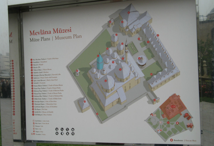Поездка началась в 8 утра в пятницу. Возят в Каппадокию по большей части из Сиде, т.е. нас сначала из Анталии отвезли в Сиде, а там пересадили в 12-местный автобусик с немцами. Нам поездка обошлась в 110 евро с человека (немецкий гид в отеле предлагал за 230 евро с каждого, покупали в уличном турагентстве, см. Часть 1 отчета о турецкой поездке). От Сиде до Каппадокии 580 км. По дороге проезжаем перевал через Торосские горы на высоте 1825м и к обеду приезжаем в город Конья (37°52'19.85"С 32°30'42.09"В), где посещаем музей и гробницу местного святого.