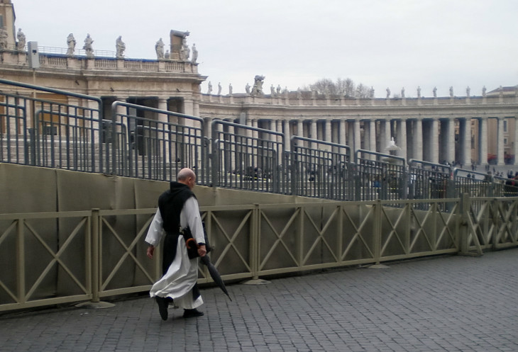 Из собора вышли на площадь. Там сфотографировал (издалека) швейцарских гвардейцев и какого-то мужика, возвращающегося с работы. По виду - почти кардинал. Хотя нет, у тех шапки красные, а у этого - серое все. Но епископ - точно.