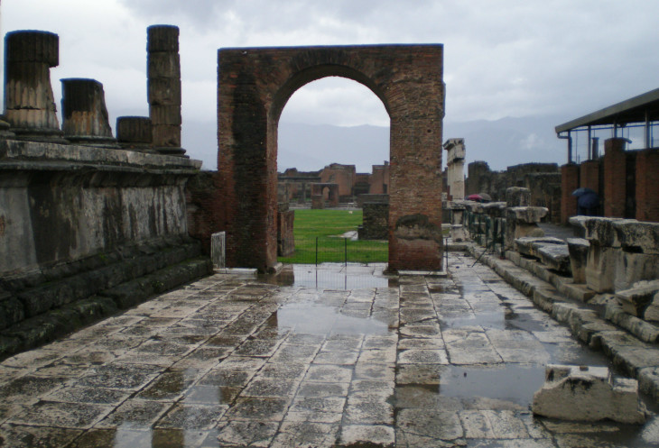 Каменные колонны, на которых все еще видны следы гари, слепки людей, засыпанных пеплом при извержении (при раскопках археологи, натыкаясь на пустоты в грунте, заливали туда гипс и в результате получались "гипсовые статуи" с костями внутри). Позы людей говорили о страшной смерти - большинство погибло от удушья... Постоянным фоном, заставлявшим время от времени оглядываться, был Везувий, расположенный на некотором удалении от города. Спокойный. Пока...