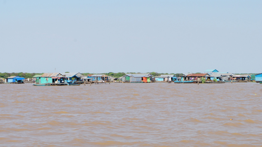 В Сиемрипе пообедали и на озеро Тонлесап. Кормили, кстати все два дня очень очень вкусно. Тонлесап – одно из крупнейших озер мира, с большими рыбными запасами. Поэтому рыболовство очень развито. На второй день нас в ресторане кормили большущей рыбой запеченной в соли – объедение, тает во рту. Февраль считается сухим периодом и озеро не полноводно, но и так впечатлило. Представляю как там в сезон дождей. Прокатились по озеру, посетили плавучую вьетнамскую деревню. В период бомбежек Вьетнама американцами, вьетнамские беженцы обосновались здесь, да так и остались.