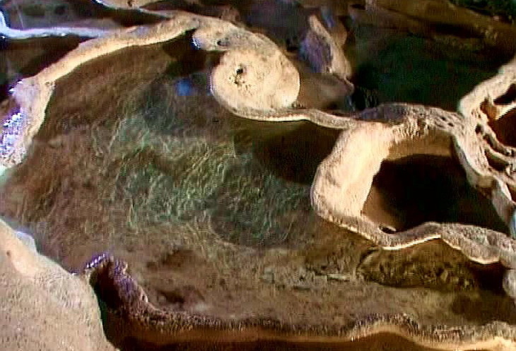 Вокруг белого спелеолога множество кальцитовых отложений, которые формируют фигурные ванночки причудливых форм с кристальной водой.
