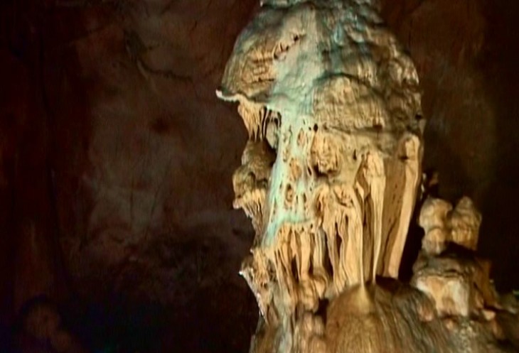 Ещё несколько шагов и проводник показывает «диковинку» под потолком. Она висит, напоминая люстру и гигантский улей одновременно. Уникальный сталактит; возраст -15 миллионов лет! (фото ниже)
