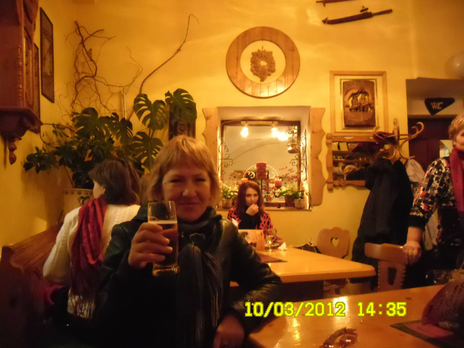 Потом мы спешно пошагали по улочкам города, дабы успеть отобедать в кафе средневековой постройки , где заранее наш предусмотрительный гид Ольга заказала столики. Кстати , хочу сказать, что все организационные вопросы , касающиеся размещения, экскурсионных автобусов, трансферов, питания и т.д. турфирмой «VIZIT EVROPE» были проведены на самом высоком уровне. Что называется, без ПРОБЛЕМ!!! Однажды, даже во время поездки , из турфирмы позвонили прямо в автобус и сообщили одному туристу о переносе времени его трансфера. Правда , некоторые гиды, несколько навязчиво рекламируют и предлагают покупать чешский гранат, раздавая при этом, также навязчиво, купоны на скидку. Они, наверное думают, что мы в России деньги печатаем. Вы знаете , сколько этот чешский гранат стоит?!