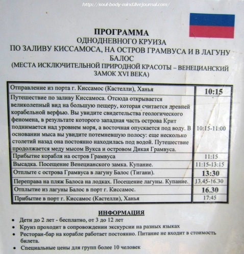 Решив увидеть что-то особенное на острове, просто подошли к одной из многочисленных точек продаж экскурсий в Платаньяс на улице. Любезный менеджер рассказал о замечательной лагуне, однако их автобусы возят туда туристов в четверг, пятницу и субботу – в эти дни мы уже разглядывали бы Крит лишь на фото в дождливой Украине.