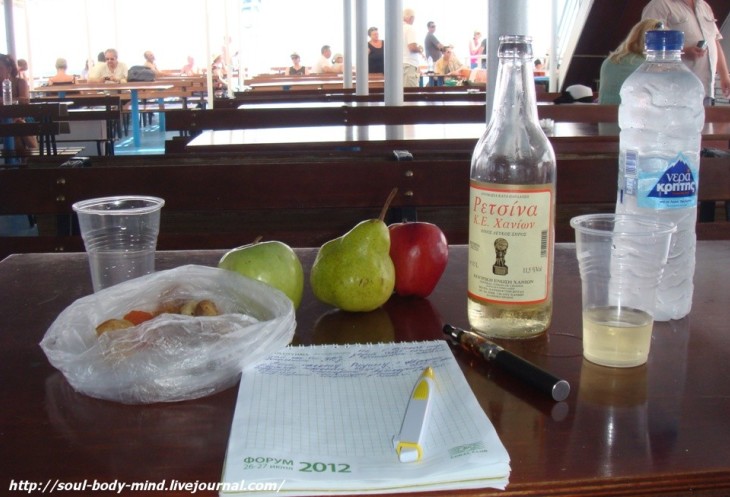 Мы брали с собой фрукты, воду же можно купить на борту. Как и Рицину – эксклюзивное критское вино, дегустацию которого мы оставили почему-то именно на эту поездку. Это стоит попробовать, белое вино на любителя, настоянное на сосновой смоле и имеющее потрясающе запоминающийся вкус и аромат елки. Его продают именно в таких вот бутылочках.