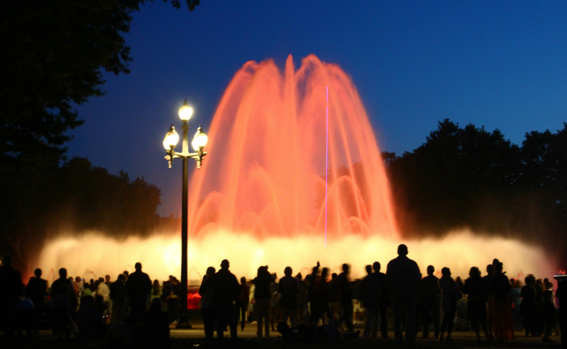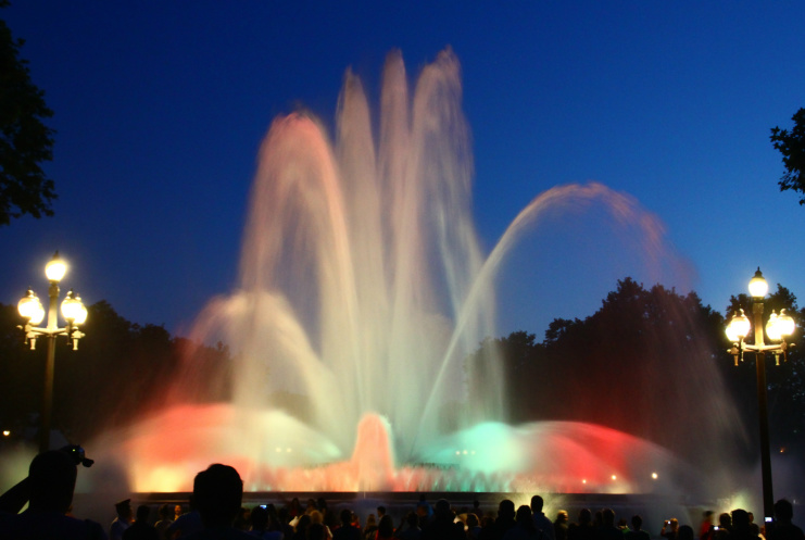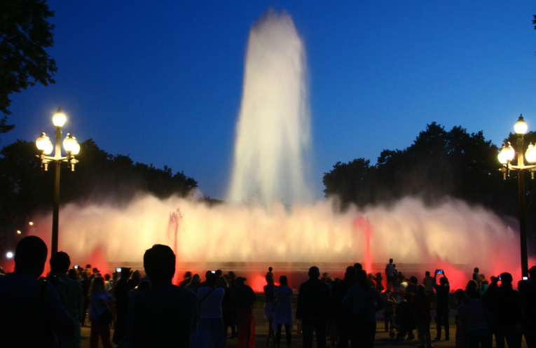 Ищем местечко, где приземлиться, желающих посмотреть на фонтаны огромное количество, все шикарные места заняты, но нам таки удается удобно разместиться. Насладились феерией света, воды и звуков, конечно, вся красота началась, когда на город спустилась ночь (опять порадовалась настоящим черным ночам).
