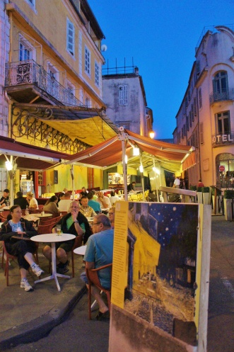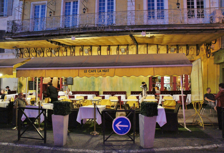 В первый же вечер мы гуляли по городу до темноты. Наконец-то вышли к людям. Самое оживлённое место - это площадь с "ночным кафе". В городе много мест, обозначенных картиними Ван Гога. Ведь именно Арль этот художник-импрессионист выбрал, как место обустройства своей коммуны, где он собирался жить и писать картины со своими сподвижниками. Но потом ничего не вышло, Винсент Ван Гог очень расстроился и до конца жизни лечился в госпитале Арля, а потом Парижа, где и скончался. Многие уголки Арля он запечатлел на своих картинах. В том числе и "ночное кафе".