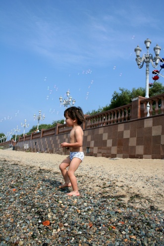 Пошли на Спортивную набережную. Там купаться, вроде бы, запрещено, зато красивая набережная и отличный вид на море. Поскольку купаться мы не любим, да и вода прохладная, то намочили ноги в Тихом океане и нам этого хватило. Деня с удовольствие кидал камешки в воду, а потом пытался их выловить, на этот раз даже не забоялся волн.