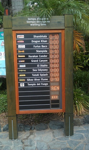 Позади меня на "среднем" плане красненькая петля - эта одна из трёх мёртвых петель Dragon Khan. Если по-русски - ниразу это не "Хан Драконов" Это "Прощай завтрак". Слава Богу, перед каждой горкой на входе есть чёткие и понятные картинки специально для русских туристов с указанием всех требований, при соблюдении которых вас допустят до аттракциона. На Драконе отдельное предупреждение. Не кушать за 3 часа до посещения и не употреблять спиртных напитков. Слав те яйца, послушался. Несколько мёртвых петель и пара переворотов вокруг оси на 180 градусов ни разу не способствуют лёгкой усваяемости даже лёгкого английского завтрака из яишенки с беконом. Шансов же выйти на своих двоих после пары кружек местной Эстреллы (Estrella Damm Premium) воообще ноль целых хрен десятых. К сожалению мои ощущения были сродни третьему прыжку с парашютом. Т.е. "по барабану, долечу-не долечу, главное на ужин успеть". Ибо перед Драконом уже были покорены Кондор и Шамбала, после только лишь двух этих "покатушек" можно спокойно дёргать тигра за усы и 2 августа тыкать пальцем в грудину пьяному десантнику с вопросом "А ты в каком ВУЗе училась - зебра бело-голубая".