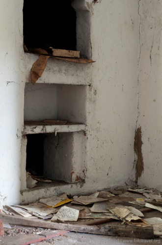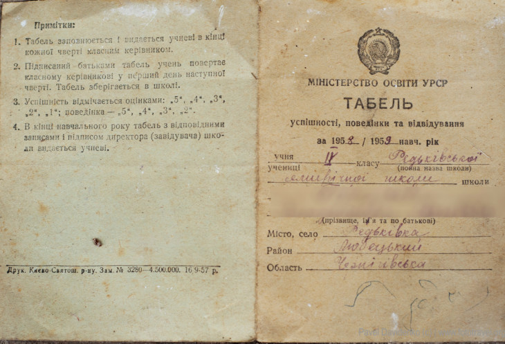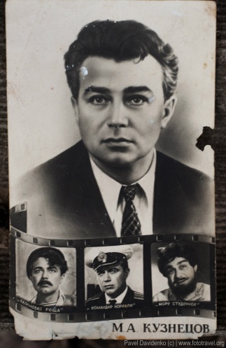 В развалинах одного дома по полу было разбросано много мусора, среди которого я нашел несколько любопытных документов и фотографий. Пенсионное удостоверение 1956 года выдачи, школьный табель за 1958/59 учебный год, фотография интерьера дома с его жильцами, фотография женщины в автомобиле на фоне двора и фасада дома, а также открытка кумира тех годов – актера М. А. Кузнецова.