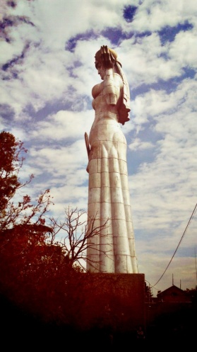 Итак, на второй день мы идем про проложенным тропам к Мосту Мира, и уходим в сторону Шардена. Шарден это улочка с бесконечными кафешками, ресторанами, барами, кальянными и хинкальными. Идем куда глаза глядят. Глаза у моей подруги глядели вверх. Вверху крепость Нарикала. Поднимаемся пешком на гору, гуляем по смотровой площадке, доходим до Матери Грузии… Оооочень эффектная женщина. Там канатная дорога. Спустится бы на канатке, да вот беда. Подруга боится высоты. Я оказалась чуть чуть дипломатом и все таки уговорила ее на спуск, пообещав не раскачивать кабину. Это было первым героическим преодолением боязни высоты, но она еще не подозревала, что ждет ее в лунопарке в Кобулети. Но об этом позже. Если не совру, спуск на канатке стоит около 40 рублей. Спускаясь любуешься красотами могучего Тбилиси, какой же он разный! Дальше наши дни проходили в изучении улочек города.