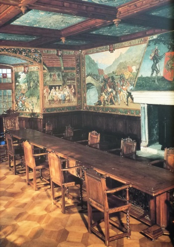 В Бургундском зале хранятся военные трофеи воинов Швейцарской Конфедерации, среди которых три роскошные мантии ордена «Золотое Руно», а в зале Королевских чиновников - статуя Святого Себастьяна, помогавшего местным жителям во время страшной эпидемии чумы, и гербы разных семей. В Караульном зале привлекает внимание огромных размеров камин.