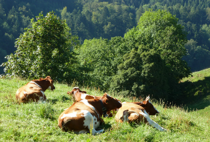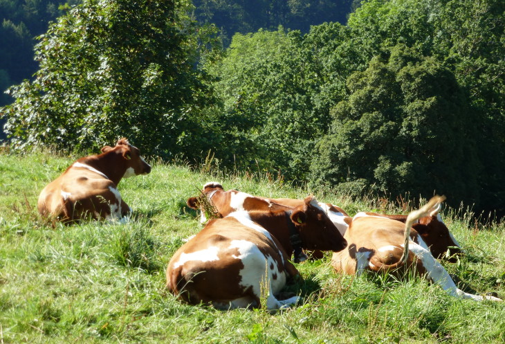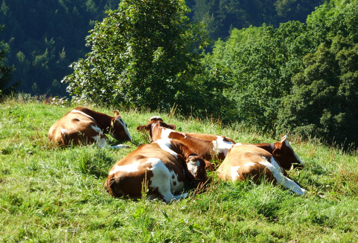 Не обращая внимания на туристов, как и на облепивших их насекомых коровки любовались умиротворяющим пейзажем.