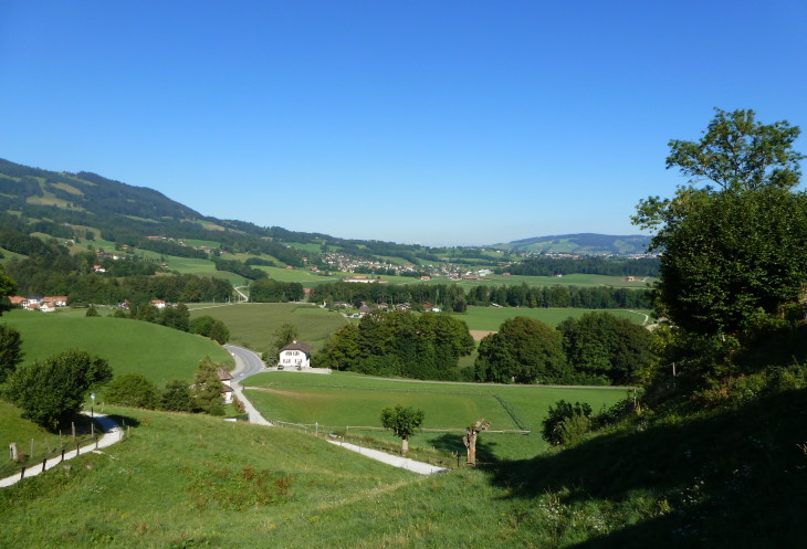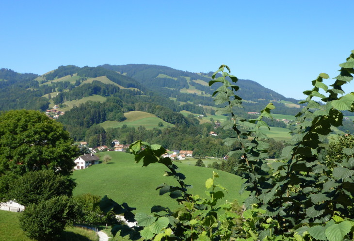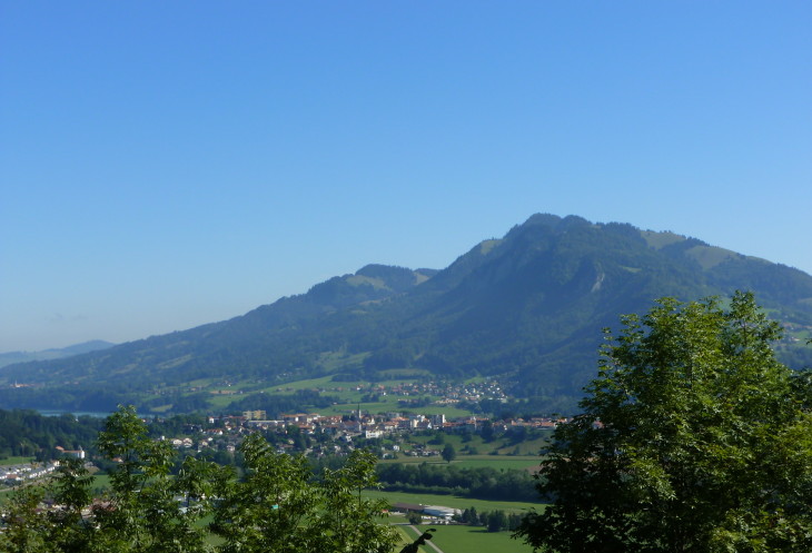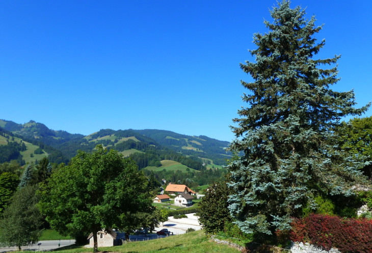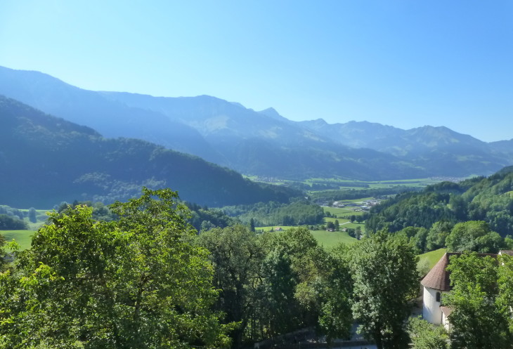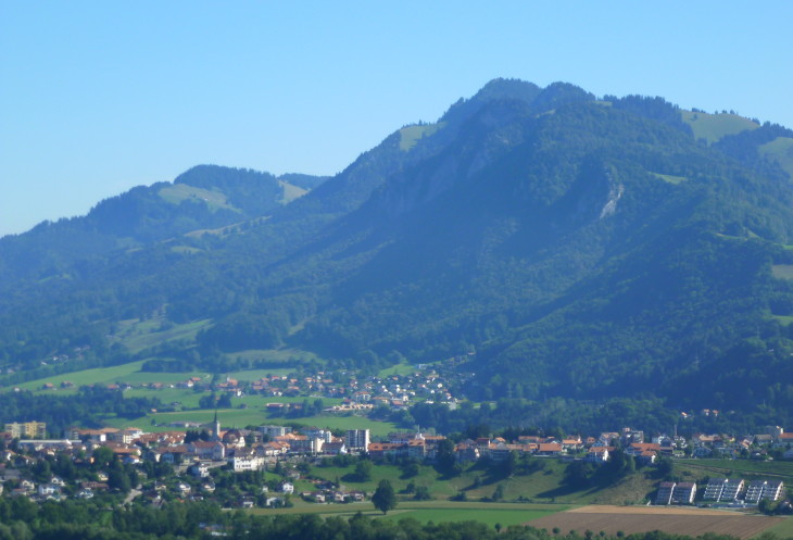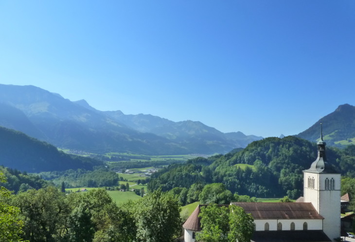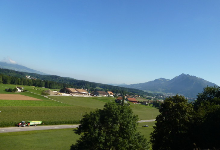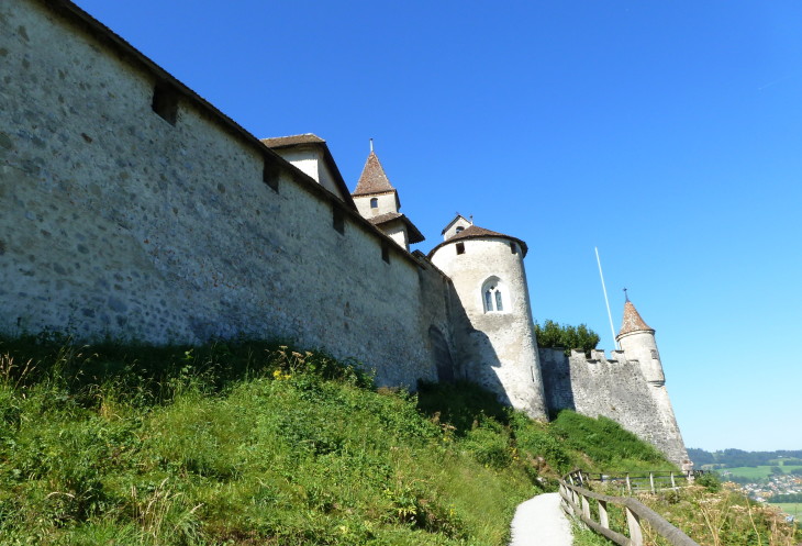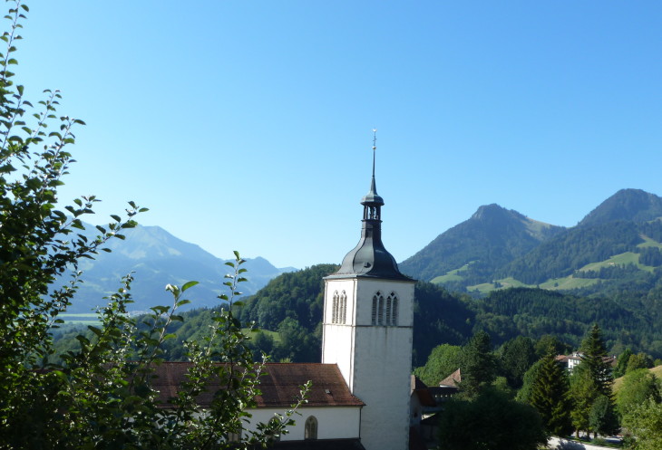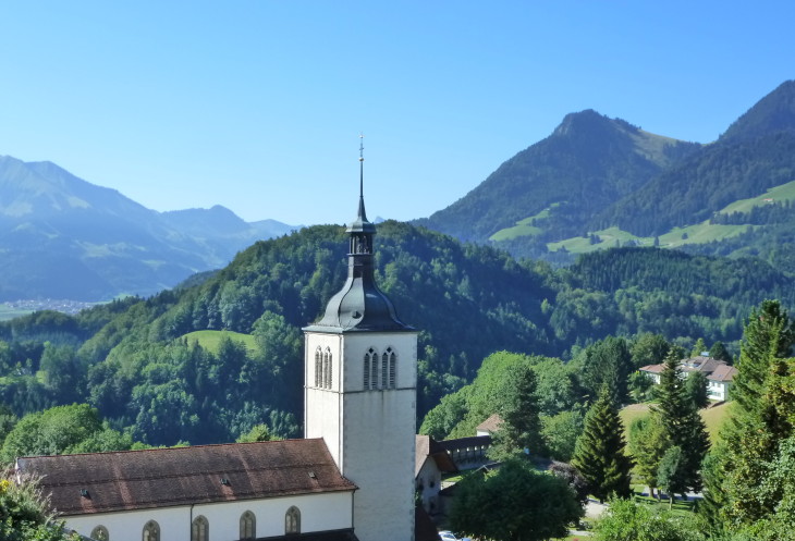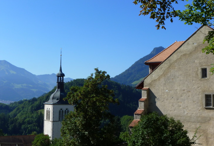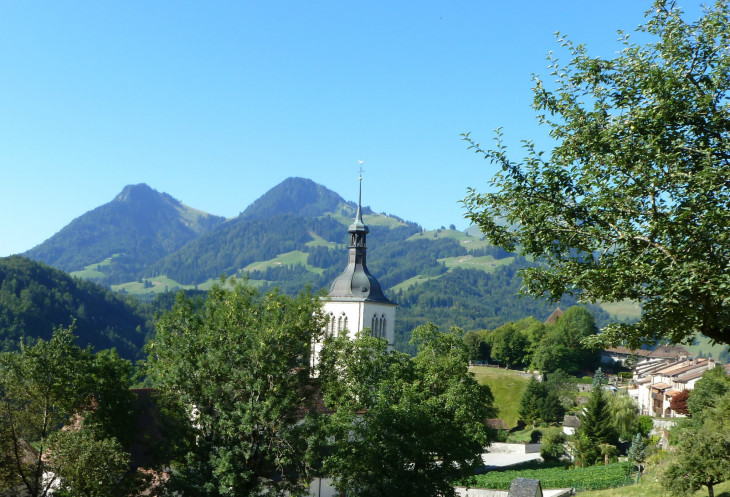С высоты замка Грюйер открывается удивительный вид на окрестные поля и милые деревеньки у подножия гор, среди которых выделяется гора Молезон, высотой 2003 метра, которая является крупнейшей в регионе Фрибург.