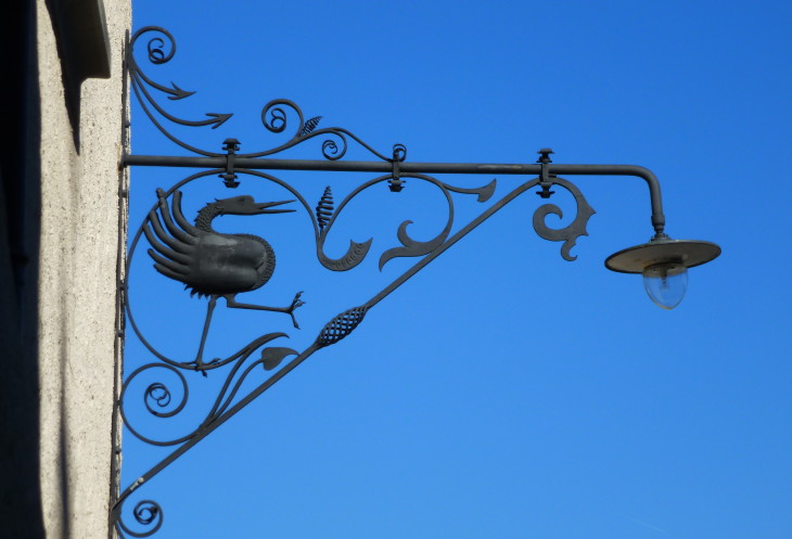 Название замка XI века, как и городка у его подножья, произошло от французского слова «grue», что означает «журавль». Естественно, журавль здесь повсюду: на клумбе, что при входе в городок, на металлических вывесках, флагах, гербе, украшающем ворота замка…