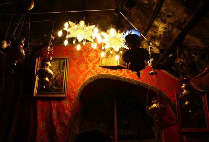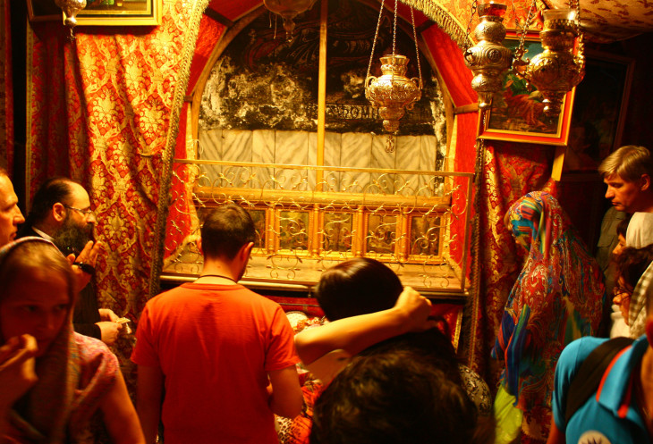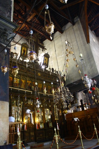 После посещения монастыря Святой Марии Магдалины мы спустились к подножью Масличной горы и сели в микроавтобус. Путь наш лежал в Вифлеем! Город находится на территории Палестинской автономии, поэтому чтобы попасть туда, нужно проехать через КПП, на котором могут проверить документы. Нас никто не проверял, и мы спокойно проехали в центр Вифлеема. Именно там находится Храм Рождества Христова. Снаружи Храм не представляется чем-то примечательным, поскольку строился, разрушался, перестраивался… И было так много раз за его многовековую историю... Впрочем, внутри тоже все скорее дышит стариной, нежели величием, но, как сказал мне один гид, «главное ведь место, а место это – здесь». Чтобы спуститься в маленькую комнатку под алтарем, где когда-то была пещера и в яслях лежал младенец Иисус, нужно отстоять очередь. Нам повезло – народу в момент нашего приезда было не много. Однако, пока мы стояли, очередь выросла раза в три! Здесь, в Гроте Рождества, установлена серебряная Вифлеемская Звезда – символ рождения Иисуса Христа и место поклонения христиан со всего мира. Как и Храм Гроба Господня, этот храм делят между собой несколько христианских конфессий. Отчасти поэтому он много лет стоит довольно обшарпанный – хотят отремонтировать, но никак не договорятся, как поделить расходы :(