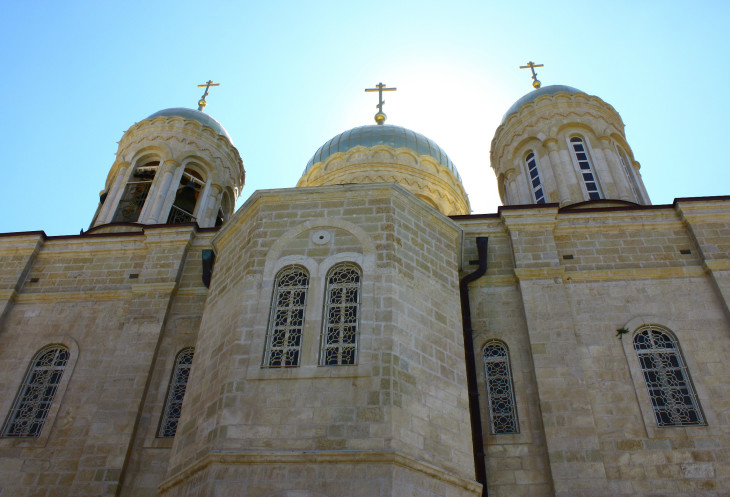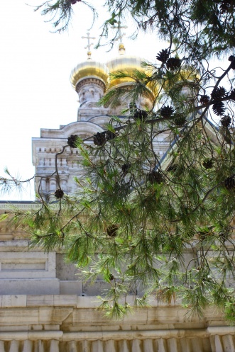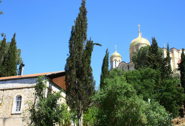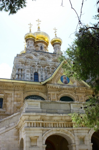 К отелю «Дан Панорама» в Иерусалиме подъехал микроавтобус и забрал на экскурсию. На часах было около 9 утра... Сперва мы отправились на Масличную гору, откуда есть возможность несколько минут полюбоваться панорамой Иерусалима, сделать фотографии… Потом спустились по этой самой горе к монастырю Святой Марии Магдалины. В отличие от большинства Святых мест в Иерусалиме, которые принадлежат католикам, сюда просто так зайти в любое время не получится - только в составе группы или если договоришься с монахинями. Ну и конечно, нужно соответствовать «православным» требованиям. Т.е. должны быть закрыты плечи и колени, а у женщин еще и покрыта голова!
