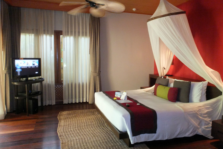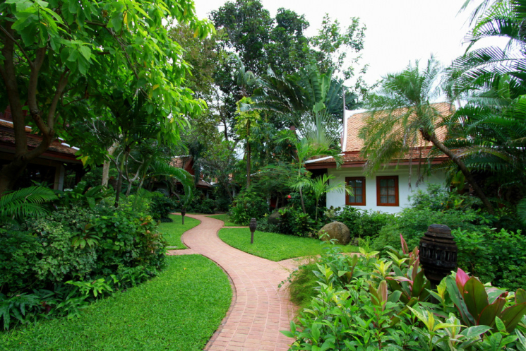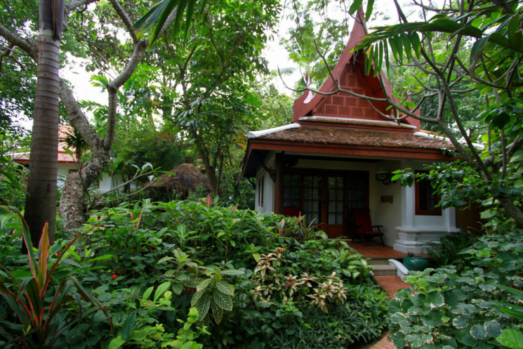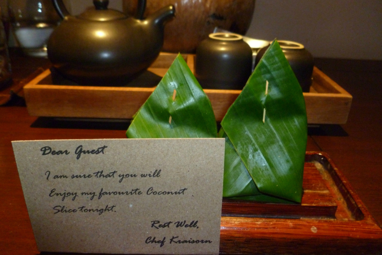 Дизайн у вилл в традиционном тайском стиле. Редкий случай, когда местный колорит идет не в ущерб европейскому комфорту. Каждая вилла построена в виде буквы L и состоит из двух зон – гостиной и спальни. Плюс шикарная терраса с лежаками, утопающая в заборе из зеленых кустов. Уборка производилась два раза в день, когда нас не было в номере. Каждый вечер в номере оставляли комплимент от отеля – пирожные, печенье или тарелку с фруктами.