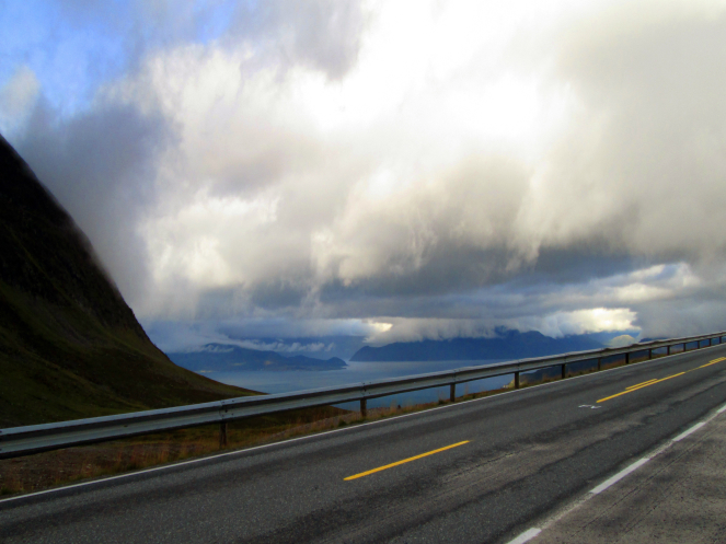 Хотели доехать до пос. Скутвик, откуда утром планировали на пароме отправиться поближе к юго-западной оконечности гряды Лофотенских островов в Свольвер, но уже быстро темнело и пришлось заночевать не доезжая намеченной цели около 30 км в придорожном кемпинге Фиске.