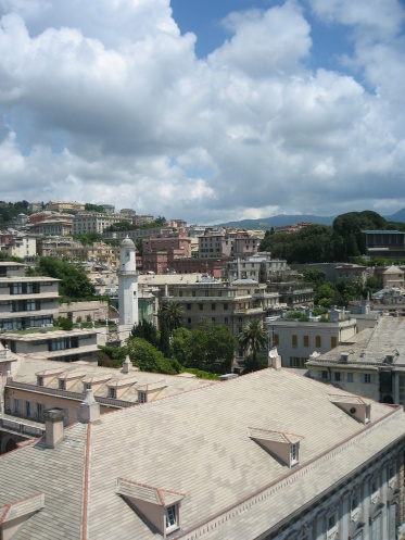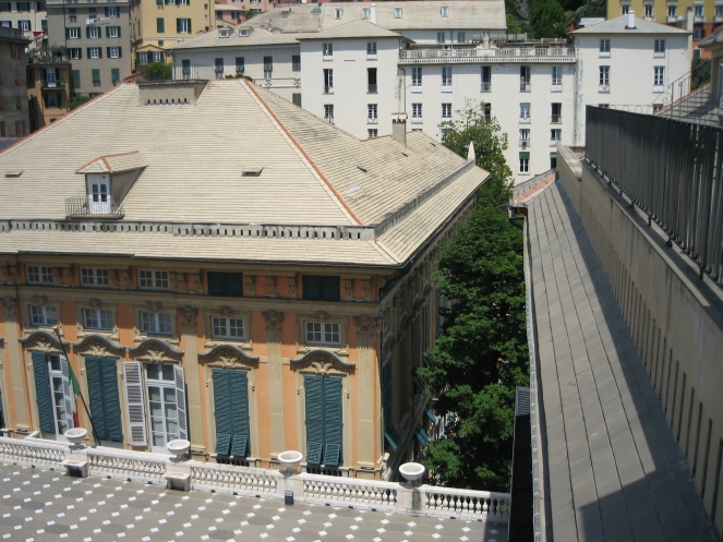 Итак, в Генуе самая большая колекция произведений изобразительного искусства находится в т.н. Музеях Новой улицы (I Musei di Strada Nuova) -- дворцах (палаццо) Белом (Bianco), Красном (Rosso) и Турси на ул. Гарибальди (она же Новая). Туда мы и отправились, оставив чемоданы в гостинице (т.к. в тот же день планировали поехать в Кьявари). В Палаццо Реале, который был от нас в трех минутах ходьбы по ул. Бальби, мы не пошли, т.к. коллекция живописи там меньше. Поскольку это был мой первый музей в Италии, ожидания были велики, тем более что в буклетах было написано, что там хранятся полотна Рубенса, Ван Дейка и других знаменитых живописцев. Как выяснилось, картина Рубенса там только одна, с Ван Дейком повезло больше, т.к. он писал портреты генуэзской знати, которые заняли целый зал:) В общем, мы долго ходили по огромным залам и коридорам (генуэзские правители были люди небедные, и палаццо строили на славу:) и вышли к холлу с лифтами и окнами во двор (разумеется, весьма живописный). Я достала фотоаппарат, чтобы его сфотографировать, и тут к нам на английском языке обратился один из сотрудников музея. "Зачем Вы здесь фотографируете? Давайте покажу место, откуда действительно хорошие фотографии получатся!" Он подвез нас на лифте до верхнего этажа и провел на крышу, откуда действительно открывался замечательный вид на город! Спасибо доброму сеньору за замечательные фотографии! Даже моей мыльницей удалось что-то снять:)