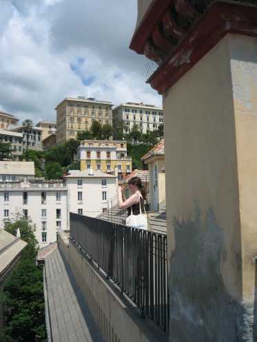 Еще одна интересная особенность Генуи в том, что город поднимается от моря довольно высоко вверх. Это вообще особенность лигурийского рельефа местности, вдоль побережья можно даже увидеть своеобразные "террасы" (см. об этом в заметке про заповедник Чинкве-Терре). А в Генуе, чем дальше от моря отходишь, тем выше нужно подниматься. За улицей Бальби, на которой стоял наш отель, возвышались целые кварталы, правда, с туристической точки зрения интереса не представляющие. В путеводителе я читала, что есть специальные лифты, чтобы подняться в такие места, но нам они как-то не попадались или мы их не заметили (хотя они были, судя по всему, где-то рядом). Ради интереса мы один раз зашли в высокостоящий квартал недалеко от туннеля Гарибальди, но ничего интересного там не обнаружили, в основном жилые дома. Подниматься и спускаться было непросто, так как гора оказалась довольно крутая. С таких "возвышенных мест" открывается замечательный вид на город и порт.