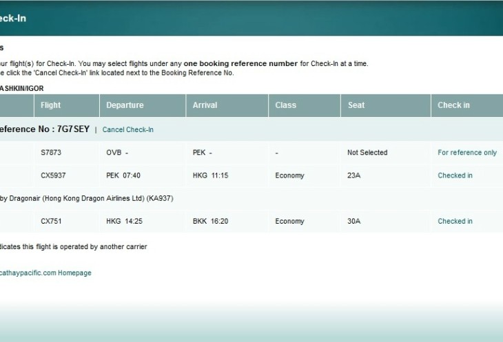 Теперь о нашей проблеме. Проблема заключалась в том, что нам надо было зарегистрировать багаж до конечной точки нашего путешествия, то есть до Бангкока. Пересадки у нас были короткие, особенно в Пекине, - 1 час 45 минут! Вот только даме на стойке регистрации почему-то не очень хотелось заниматься оформлением. Выразившись в духе "и ходют тут, и ходют", обвинив кассиров аэропорта, что они не полностью внесли в компьютер данные нашего рейса, она долго отказывалась выполнять свою работу. И это при том, что у авиакомпании S7 есть код-шеринговое соглашение со всеми перевозчиками на пути нашего следования. Только когда дама поняла, что мы будем стоять до победного, никуда не собираемся отходить и готовы вызвать представителя компании S7, буквально за 10 минут оформила документы.