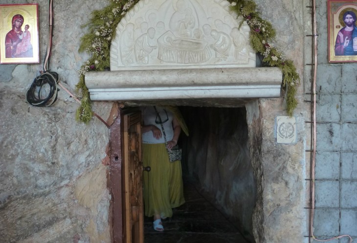 Пещера имеет форму креста. Возможно, ее облик и определил положение будущего монастыря. Длина храма 21,5 метров, а ширина – всего 2,5 метра. Главный канал пещеры самый большой, в нем находится алтарь, а по бокам расположены небольшие капеллы. Стены и потолок украшают росписи на религиозные темы. Что-то осталось еще от древних христиан, но большая часть выполнена рукой преподобного Симеона и, надо сказать, очень искусно! Особенно меня поразило изображение Христа в левой капелле. Разве можно так нарисовать простым углем на простом камне? Ощущение полного присутствия!.. Такие добрые, живые глаза!.. Встретишься с ними взглядом и ловишь себя на мысли – что же он мне сейчас скажет?..