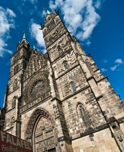 Едем в центр. Изначально планировали на метрошке, но разболелась Таня. Такси недорогое, всего лишь вдвое дороже метро. Если на троих. А можно, как выяснилось на обратном пути, и на шестерых заказать такси за те же самые деньги! Это вот Германия!.. Т.к. в программе был поход по магазинам, мы не попали в самые интересные места города, в Бург или на территорию первых съездов НСДАП. Церковь Святого Себальда (Sebalduskirche):