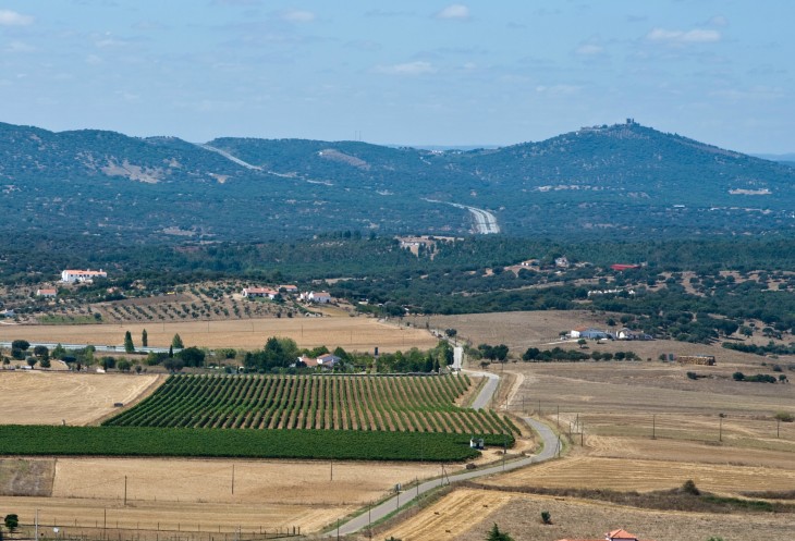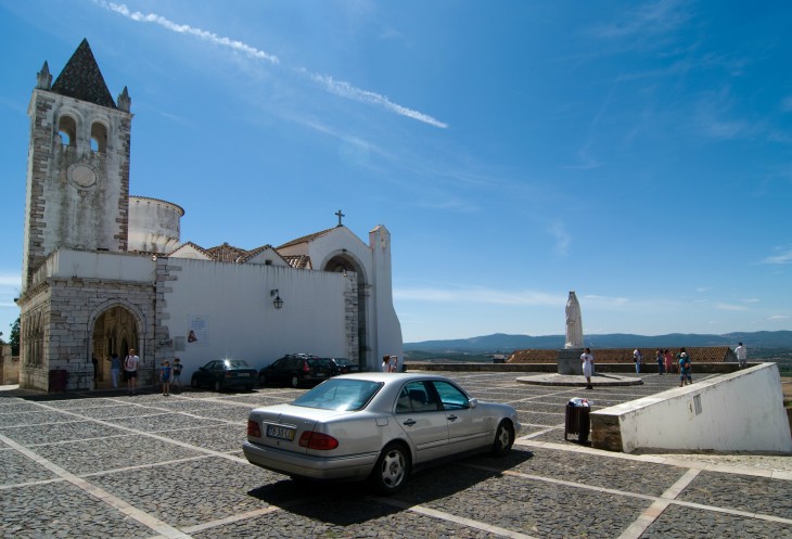 И опять из пробки! Хотя можно было бы ожидать чего-нибудь поизящнее. Эштремош славен тем, что в его окрестностях добывается 85% мрамора в стране, а сама Португалия при этом является вторым крупнейшим в мире экспортером минерала. Побродив по рынку около часа, двигаемся к замку и паркуем машины снаружи крепостной стены, хотя, как оказалось можно заезжать и внутрь. С парковки как и положено для оборонительного сооружения, открывается неплохой вид. Вдали, примерно в 10-12 километрах от нас, замок в Эвора Монте.