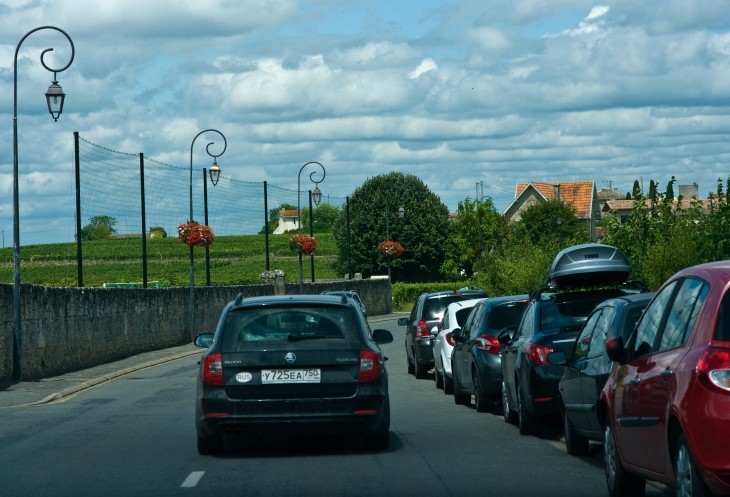 В итоге мы купили какой-то Saint Emilion и Lolande de Pomerol в диапозоне 10-15 евро за бутылку. Две следующие ночевки нам нужно будет пить Рону, чтобы не выйти за границы хотя бы платного диапазона (3 л - беспошлинно, четвертый и пятый литр облагаются пошлиной, больше 5 литров ввозить нельзя). Отоварившись, выдвигаемся в сторону городка. Парковать машины здесь начинают задолго до знака "Saint Emilion".