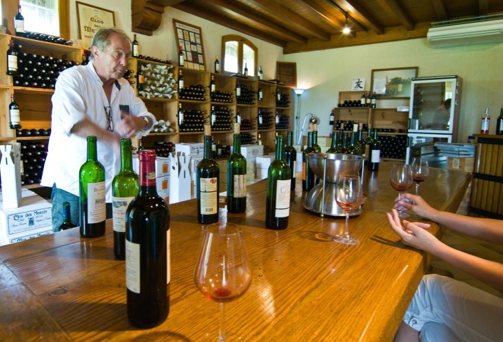 Заходим. Внутри на стульях спит мужичонка в белом халатике. Это менеджер, впаривающий продукцию виноделов. Бонжур-бонжур. И естественный вопрос - чего желаете. Таня объясняет какое вино (в плане вкуса и сортов) мы бы хотели купить и дядька наливает из первой бутылки. Пробуем. Из второй. Пробуем. Ну и так 4 или 5. И месье "дегустировал" вместе с нами :) (позже Саша метко окрестил его "месье ноль-пять промилле"). В какой-то момент: