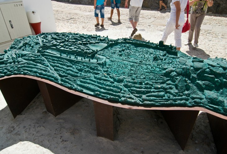 Замок - это наверное основная достопримечательность места, но есть еще и собственно деревня, которая занимает все пространство на скале, не занятое крепостью. На машине въехать в деревню нельзя. Паркуемся и начинаем подъем пешком. У самого входа в деревню пластиковая модель окрестности с указанием где что расположено.